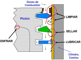 - Sellar (Fugas).- Se encarga de sellar los espacios que hay entre rines y camisas logrando con esto sellar y evitar fugas de gases de la combustión hacia el cárter.